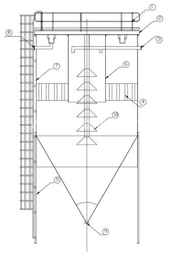 1.護(hù)欄2橋架3.加料管4.沉降斜管/斜板5.筒體及支撐6.深度布料井7.爬梯8.溢流管9.底流管10.中心澄清器
