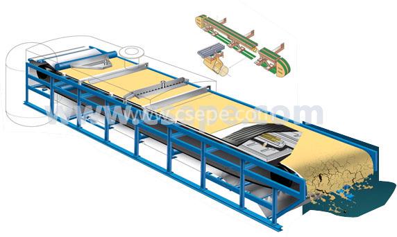 利用真空力把水和其他液體從漿液中分離出來。在FGD工藝中經(jīng)過一級(jí)旋流脫水后的石膏漿液進(jìn)入脫水機(jī)的進(jìn)料箱,在進(jìn)料端,氣體被蒸汽罩除去,漿液被均勻分布到移動(dòng)濾布和排水皮帶區(qū)域。濾餅在排水皮帶上方移動(dòng),通過真空負(fù)壓進(jìn)行脫水。真空是排水皮帶下側(cè)的真空盒產(chǎn)生的。濾餅沿脫水機(jī)的長度方向行進(jìn)時(shí),由濾餅沖洗管從上方進(jìn)行沖洗。當(dāng)濾餅移動(dòng)到真空皮帶機(jī)的卸料端時(shí),石膏漿液已經(jīng)變成了含水<10%的產(chǎn)出品,濾布從脫水皮帶上分離,進(jìn)行沖洗后進(jìn)入下一工作循環(huán)。